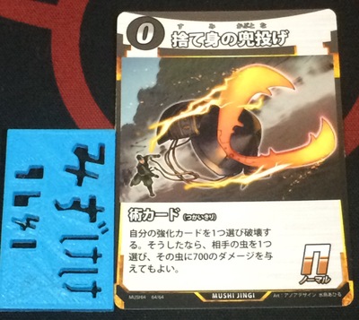自分の虫に付いている強化カードを犠牲にする事で700ダメージを飛ばせる術カード。