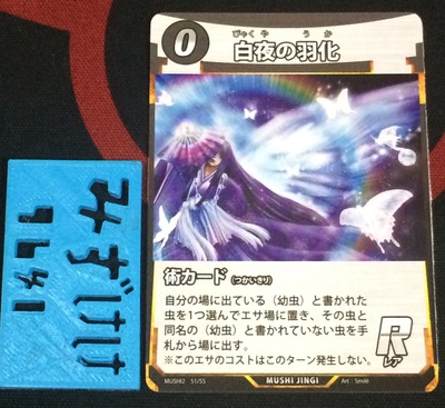 これを破壊し、自分の捨て札からこれと同名の(幼虫)と書かれていない虫を場に出す。