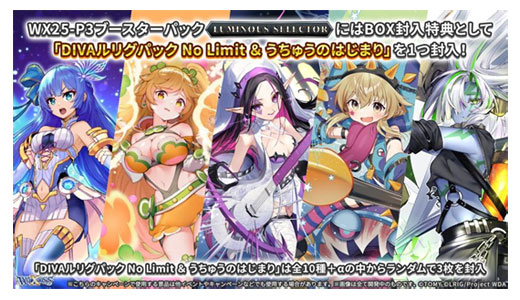 拡張パック「WX25-P3 LUMINOUS SELECTOR」の「BOX封入特典」「DIVAルリグパック No Limit & うちゅうのはじまり」は、全10種+αの中からランダムで3枚を封入!